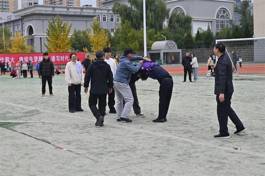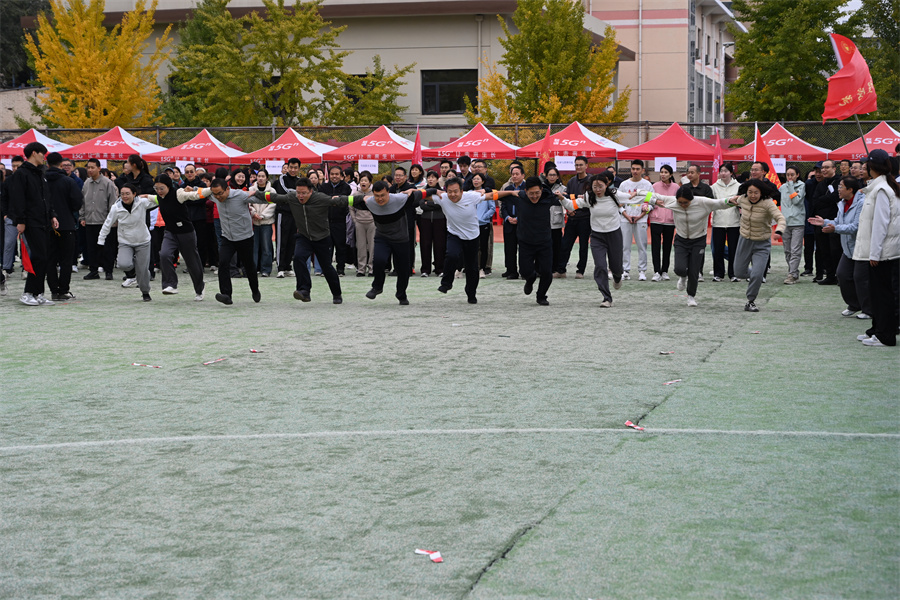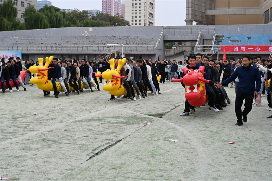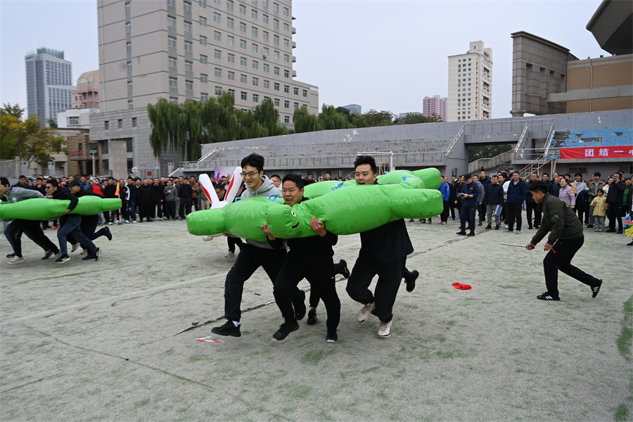 比赛过程中,参赛教职工们默契配合、奋力拼搏。“抢种抢收”似趣味赛场的“丰收”竞速,大家在紧张又欢乐的竞速中,体验着“抢”的刺激与“收”的喜悦;“旱地龙舟”赛场,大家将协作的力量凝聚成一股绳,让“龙舟竞渡”的激情在旱地之上热烈绽放;“万众一心”中彩色的呼啦圈如灵动的光环,串联起一个个并肩而立的身影,让欢乐与凝聚力在旋转的光环中不断升温;一双双色彩鲜艳的巨型“嘻哈大脚”充气道具格外吸睛,参赛队员们套上“大脚”,憨态可掬,现场笑声与加油声交织,大家在与“大脚”的趣味博弈中,尽情释放活力;“马甲跑得快” 让欢乐在接力中不断升温,弯腰、伸臂、转身……行云流水,见证着队员们之间的默契;龟兔赛跑跑道上,巨型的白色兔子与绿色乌龟造型充气道具憨态可掬,鼓鼓囊囊的模样自带喜感,瞬间点燃全场氛围;“举重若轻”是一场合力托举的欢乐挑战,八人一组让原本“庞大笨重”的球体变得“轻盈”起来,完美诠释了“众人拾柴火焰高”的真谛;奋勇向前项目中,彩色的充气堡垒如一座柔软的“欢乐山丘”,在阳光下鼓着饱满的活力,大家在这片充满趣味的“战场”上,尽情释放着奋勇向前的热情与活力;“齐头并进”中队员们肩并肩、臂挽臂,彼此紧扣手臂形成稳固的人墙,如一条紧密相连的“欢乐长龙”,在并肩奔跑中,将团结的力量化作前行的动力。最后一个项目是“混合接力”,现场加油声此起彼伏,当最后一棒队员奋力冲过终点,全队欢呼相拥,场内时时爆发出热烈的欢呼声。