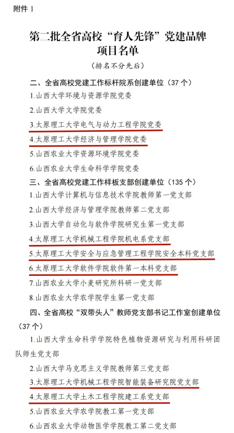 此次我校入选项目涵盖多个类别,其中电气与动力工程学院党委、经济与管理学院党委获批“全省高校党建工作标杆院系”创建单位;机械工程学院机电系党支部、安全与应急管理工程学院安全本科党支部、软件学院软件第一本科党支部入选“全省高校党建工作样板支部”创建单位;机械工程学院智能装备研究院党支部、土木工程学院建工系党支部跻身“全省高校‘双带头人’教师党支部书记工作室”创建单位。