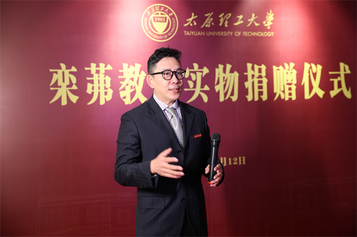 王志华代表学校向栾晶博士颁发捐赠证书,并发表讲话。他高度评价栾茀教授是“太原理工大学发展历程中一座不朽的丰碑”,是“全国知识分子的楷模”和优秀教育工作者的杰出代表。他指出,栾茀教授不仅为学校发展和煤炭人才培养作出重要贡献,更在生命最后时刻写下《煤大办学思想》万言书,病床上仍勉励学生“要做攀登科学高峰的勇士”,其精神至今熠熠生辉。王志华强调,学校将认真整理、妥善保管、充分展示这批珍贵遗物,使其成为校史教育和师德建设的重要载体。