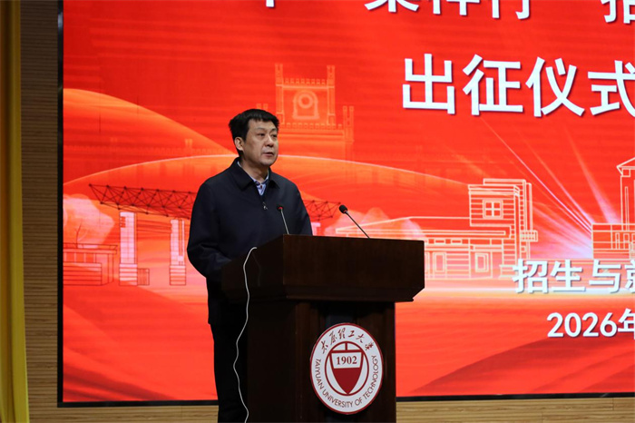 1月12日下午,太原理工大学2026年“桑梓行”寒假招生宣传活动出征仪式在明向校区学生活动中心一层报告厅举行。校党委常委、副校长王志华,招生与就业工作部、校团委、求实(宗复)学院、软件学院相关负责人及志愿者代表参加了出征仪式,仪式由招生与就业工作部负责人主持。