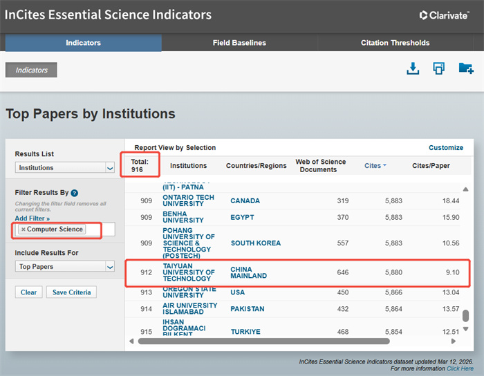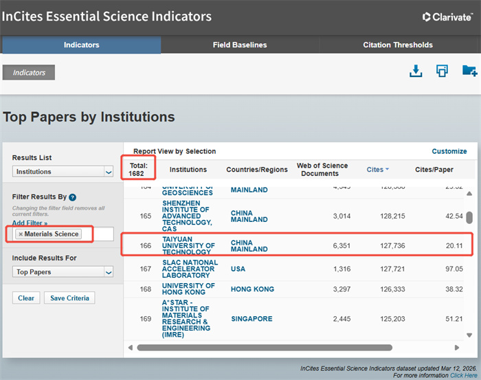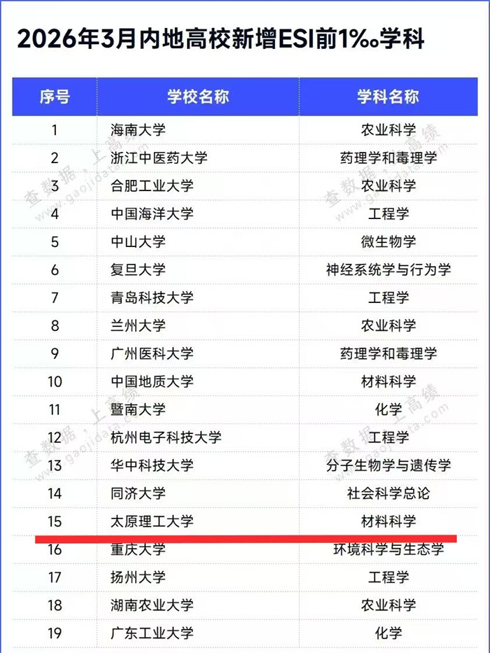 3月12日,全球权威专业信息服务提供商科睿唯安(Clarivate Analytics)发布2026年3月版《基本科学指标数据库》(Essential Science Indicators,简称ESI)最新统计结果。我校学科建设迎来里程碑式重大突破:材料科学学科首次跻身ESI全球排名前1‰,正式迈入国际顶尖学科行列,至此我校ESI全球前1‰学科增至2个;计算机科学学科首次跻身ESI全球前1%,学科建设版图再添重要增长极,学校国际学术影响力与核心竞争力实现跨越式提升。
