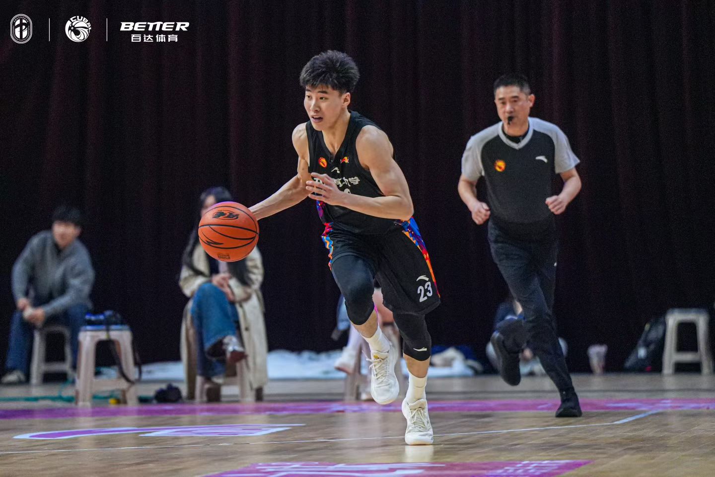 首节比赛,球队迅速进入状态,曹芷豪里突外投带动进攻,段成果强打2+1火力全开,单节打出26:10的攻击波,早早建立领先优势。次节杨虎龙三分开张,球队将优势扩大至20分以上,尽管山西大学奋力追分,我校依旧以51:35保持半场领先。易边再战,对手一度将分差迫近至11分,刘少伟、杨虎龙及时站出来稳住局面,三节战罢76:58牢牢掌控主动权。末节决战,队员们稳扎稳打,段成果、孟凡森连续罚球得分,始终将分差保持在20分左右,最终稳稳拿下胜利。