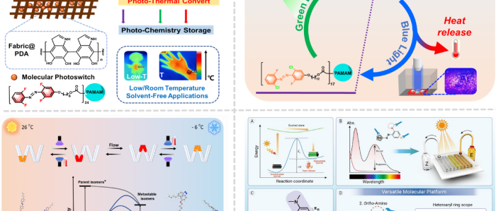 近年来,国家出台系列政策推动煤炭向 “原料、材料” 转型,助力煤炭资源绿色低碳发展。在此背景下,李文英教授团队以 “先分离后转化” 为技术研发主线,创新提出协同整合煤基液体关键组分与可持续太阳能的策略,聚焦环境友好型分子太阳能热燃料创制及高效功能化应用。其中,基于酚类化合物制备的偶氮基分子太阳能热燃料(MOST)性能突出:在特定波长太阳光照射下,母体异构体能吸收光子能量转化为亚稳态异构体;在热、光或催化剂等外部刺激下,又可发生反向转换,同时以热能形式释放存储能量。团队遵循 “分子设计 - 性能调控 - 功能应用” 研究理念,在该领域开展深入探索并取得多项成果。应用层面,团队成功研发可穿戴光储热织物,在低温环境中能实现约 12℃温升(Chem. Eng. J., 2023, 466, 143175);还开发出适用于寒冷环境除冰除霜的光储热薄膜(J. Mater. Chem. A, 2024, 12, 23723)。性能提升方面,设计的三枝偶氮苯酚衍生物,兼具优异光控固 - 液相变能力与 525 kJ/mol 的高储能密度,大幅提升光热燃料综合储能性能(Green Chem., 2025, 27, 13004)。此外,团队提出新型偶氮基太阳能热燃料分子设计策略,可在太阳光照下实现高效能量存储(Innov. Mater., 2025, 3, 100110),为相关材料开发提供新思路。