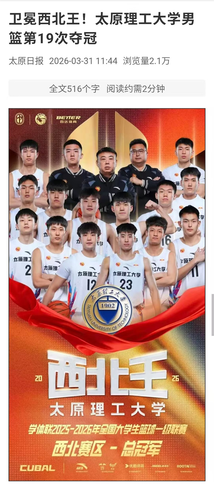 3月30日,2025-2026赛季CUBAL中国大学生篮球联赛一级联赛西北赛区决赛在西安圆满落幕。我校男篮在备受瞩目的“山西德比”巅峰对决中,以93:73力克山西大学,队史第19次加冕西北赛区冠军,续写“西北王”传奇,强势挺进全国赛。本届赛事,我校男篮展现出压倒性实力,以8战全胜的不败战绩横扫赛区,淘汰赛阶段先后战胜山西师范大学、西安电子科技大学、西北工业大学,决赛前7战场均净胜对手63分,攻防两端尽显统治力。决赛面对同省劲旅山西大学,...