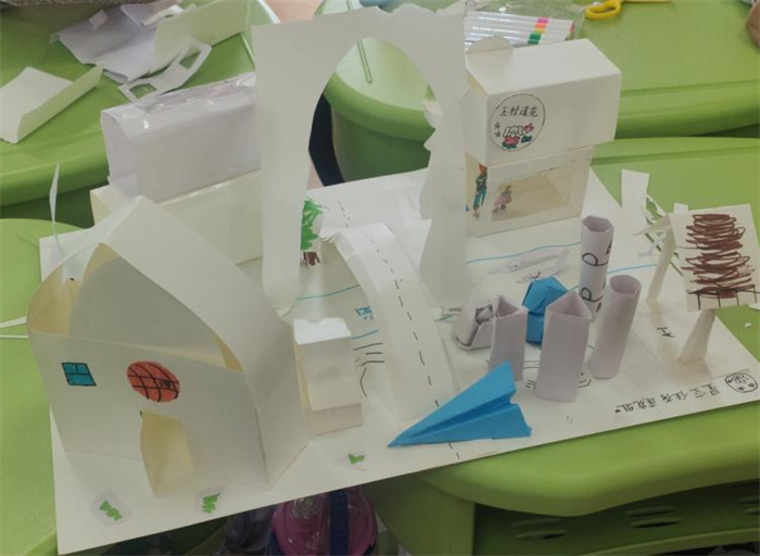 随后,引导同学们开始了“城市”建设,小朋友们化身小小建筑师,在底板纸上规划“城市”布局,利用卡纸、剪刀、彩笔拼接制作建筑模型,完成了“城市”的规划和建筑设计。