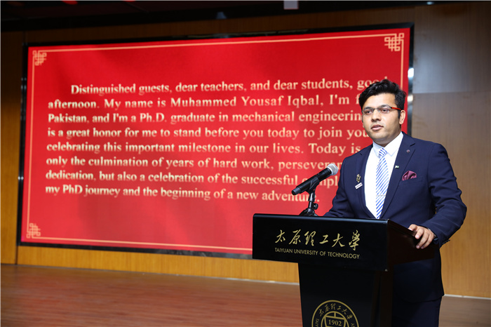 机械与运载工程学院博士研究生IQBAL MUHAMMAD YOUSAF(中文姓名:富裕,国籍:巴基斯坦)作为毕业生代表发言。他声情并茂地回顾了在太原理工大学攻读硕士、博士的七年时光,在导师的教导下与同学并肩学习、攻坚克难,最终取得学术成果的深刻记忆,并鼓励学弟学妹们以积极心态迎接语言文化挑战,以严谨态度潜心文献实验研究。