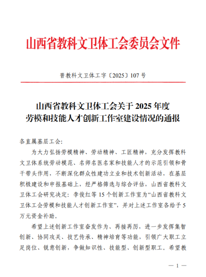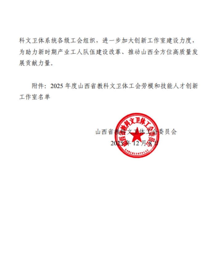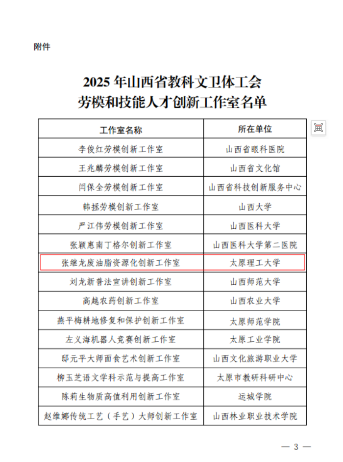 近日,山西省教科文卫体工会下发《山西省教科文卫体工会关于2025年度劳模和技能人才创新工作室建设情况的通报》,我校张继龙废油脂资源化创新工作室被命名为“山西省教科文卫体工会劳模和技能人才创新工作室”。