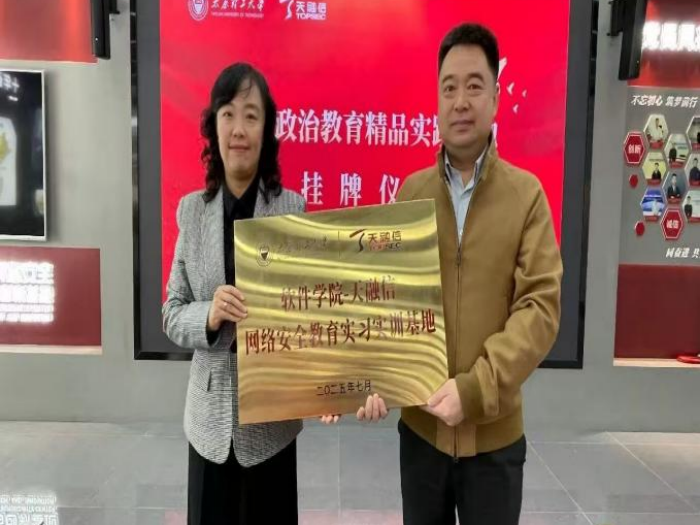 为进一步落实国家网络强国战略,强化校企协同育人实效,推动网络安全领域高素质人才培养,10月27日,太原理工大学软件学院党委书记张文基、院长赵涓涓、党委副书记郭飞一行,赴天融信教育网安基地,举行“太原理工大学综合性教育实践基地”“软件学院-天融信网络安全教育实习实训基地”揭牌仪式。国家网安基地办公室总工程师吴雷、培训中心主任徐哲,天融信科技集团湖北平台副总经理张敬民,天融信教育公司总经理卢善尧等企业及基地代表,与太原理工大学软件学院十余名在训学生代表共同见证仪式。