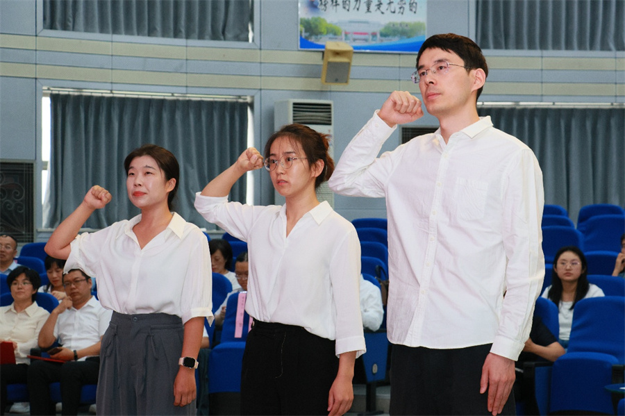 三名新入职教师高举右拳、庄严宣誓。铿锵有力的誓言,是新教师对教育事业的赤诚承诺,期待年轻的老师们扎根太原理工大学、扎根材料学院,书写属于自己的教育篇章。