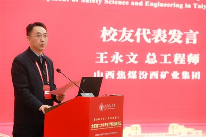 山西焦煤汾西矿业集团总工程师王永文作为安全学院杰出校友代表发言。他深情回顾了在母校的求学时光,表达了对恩师培养的感激之情,并分享了在行业一线的工作体会。他号召广大校友凝心聚力,持续关注和支持母校发展,共同搭建学院与业界协同发展的坚实桥梁。