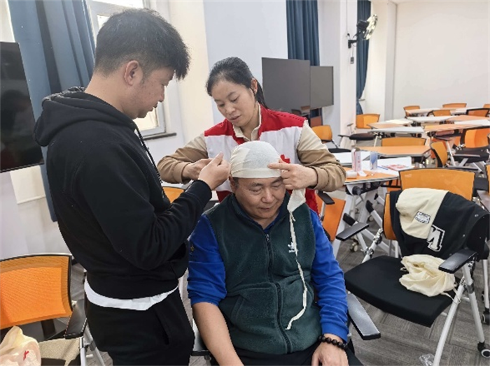 下午进入实操技能培训与考核环节。讲师通过分步骤演示、细节重点强调等方式,向教师们直观展示了成人心肺复苏(CPR与AED配合使用)的实际操作流程、外出血情况下的止血方法与不同部位的包扎技巧。在讲师的悉心指导下,参训教师们分组进行了反复、认真的模拟练习,逐一规范动作要领,确保每位教师都能准确掌握核心救护技能。随后,严格的实操考核依次进行,重点检验教师们对心肺复苏流程、AED操作及创伤包扎等技能的熟练程度与规范性。
