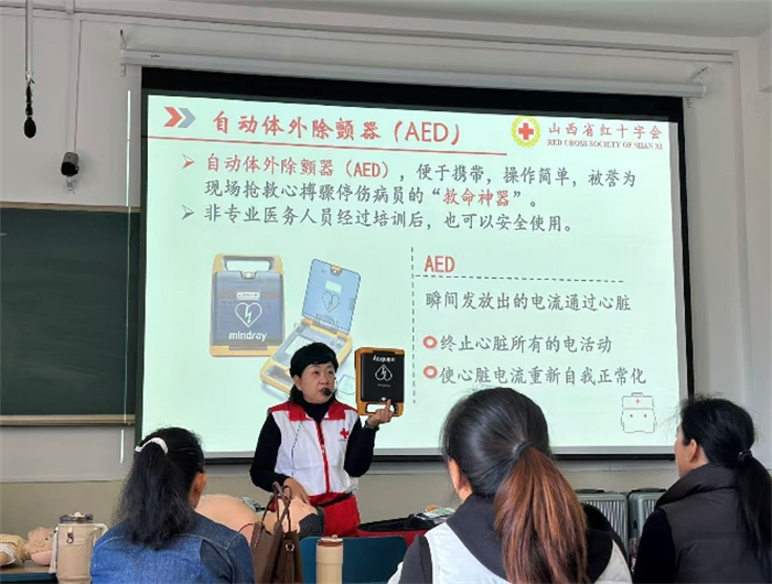 本次培训内容详实,结构紧凑,严格遵循红十字救护员培训大纲。上午为理论知识学习与考核阶段。山西省红十字会的专业讲师系统讲授了红十字运动的基本知识、现场救护的通用原则与标准程序,并重点深入讲解了现场心肺复苏(CPR)的全流程操作技术,包括意识判断、呼救求援、胸外按压、人工呼吸等关键环节,特别涵盖了自动体外除颤器(AED)的使用方法以及针对不同人群气道异物梗阻的急救手法(如海姆立克急救法)。此外,课程还涉及创伤救护的基本技能(止血、包扎、固定、搬运),以及常见急症(如休克、晕厥、心脏病发作)和意外伤害(中暑、烧烫伤等)的现场应对措施。理论学习结束后,全体参训教师通过线上答题方式完成了理论知识考核,巩固了所学内容。