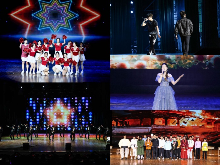 啦啦操《Good Time》活力四射,瞬间点燃全场互动热情。舞蹈《胜利之舞》动感十足,舞步利落有力,舞出青春的自信与洒脱。合唱《苦茶》与独唱《如果有来生》温情脉脉,歌声真挚感人,触动人心。小品《富士游侠》包袱密集、笑点不断,更巧妙融入爱国情怀与正能量元素,以诙谐方式传递家国担当,现场笑声、掌声此起彼伏,氛围持续升温。