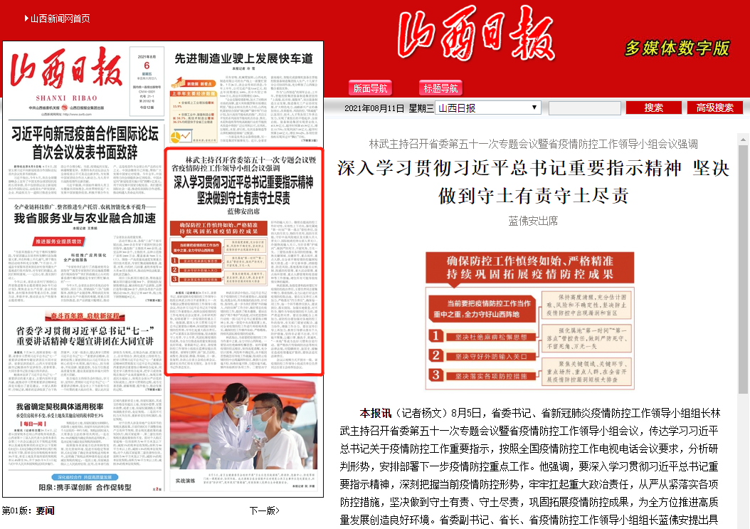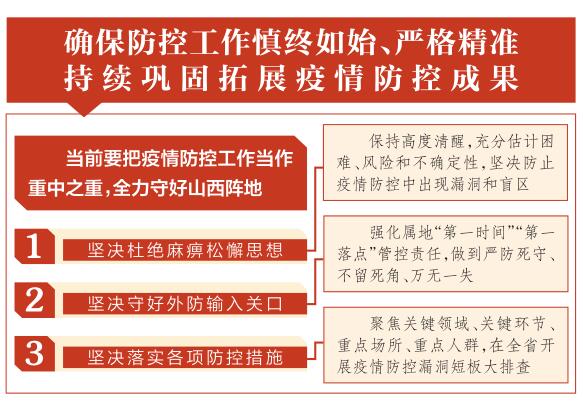 林武指出,当前要把疫情防控工作当作重中之重,全力守好山西阵地。一要坚决杜绝麻痹松懈思想。始终紧绷疫情防控这根弦,保持高度清醒,充分估计困难、风险和不确定性,决不能因思想疏忽而导致工作疏漏,坚决防止疫情防控中出现漏洞和盲区,做到斗志丝毫不松、标准丝毫不降、力度丝毫不减,慎终如始抓好各项工作。二要坚决守好外防输入关口。继续在提高防控工作针对性、实效性上下功夫,强化属地“第一时间”“第一落点”管控责任,坚持人防尽其力、物防尽其用、技防尽其能,守好中高风险地区及关联人员入晋关口、国际航班经停太原入晋关口、冷链物流输入关口,当好首都“护城河”,做到严防死守、不留死角、万无一失。三要坚决落实各项防控措施。聚焦关键领域、关键环节、重点场所、重点人群,在全省开展疫情防控漏洞短板大排查,进一步完善举措、消除隐患、防范风险,落地落细灵敏反应机制、院感防控管理、重大活动管理、重点场所管理、重点人群管理和疫苗接种等工作措施,堵住所有可能导致疫情反弹的漏洞。