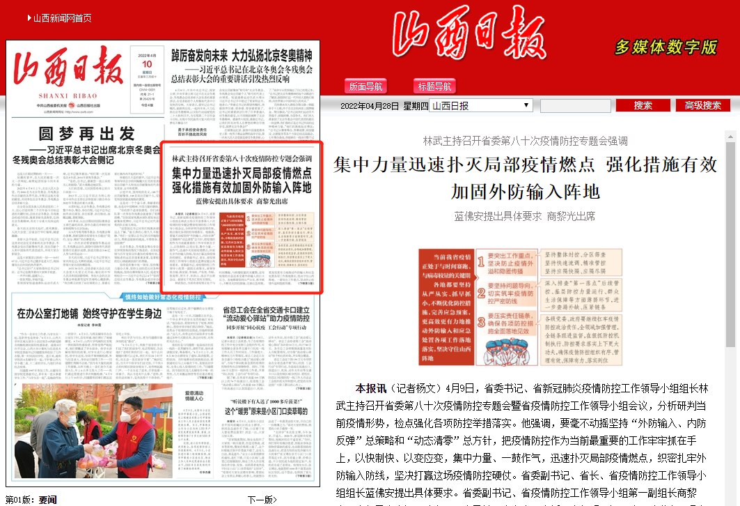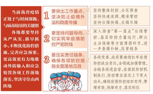 林武指出,当前我省疫情正处于与时间赛跑、与病毒较量的关键期,没有疫情的市县还承受着外防输入的巨大压力。各地都要坚持从严从实、抓早抓小,不断优化防控措施,完善应急预案,更高效更有力地推动外防输入和应急处置各项工作落地落实,坚决守住山西阵地。一要突出工作重点,坚决防止疫情外溢和隐匿传播。坚持整体封控、分区筛查,对疫情防控重点区域实施整体封闭,做到不出不入,加密抗原和核酸检测频次,尽快把风险人员全部筛出来,确保隔离管控到位。坚持快速流调、精准管控,进一步充实流调力量,强化技术手段支撑,用最快速度确定感染源、传播链。坚持应隔快隔、应隔尽隔,隔离房间也要及时扩容,确保足量达标。要强化底线思维,做好打大仗的思想和工作准备,持续加强疫情防控各方面能力建设。二要坚持问题导向,切实筑牢疫情防控严密防线。深入排查“第一落点”后续管控、基层防控力量运行、群众生活保障等方面薄弱环节,进一步查漏补缺、压紧链条。卡口临时党支部必须充分发挥战斗堡垒作用,加强工作统筹,确保遇事及时拍板决断;点对点转运必须周密闭环,送、接、管紧密衔接,信息传送同时到位,决不能出现漏管失控,造成疫情传播风险;隔离管控措施必须严之又严,决不能居家不真居、隔离不真隔;健康码赋码必须及时精准,决不能出现风险人员赋码慢甚至未赋码的现象;民生底线必须兜稳兜牢,及时回应群众关切,决不能出现重要生活必需品短缺、大幅涨价,以及影响群众正常就医等情况;社区和街道党组织必须加强力量统筹,组织好基层一线工作队伍,决不能力量分散、工作失序。要坚持疫情防控和保通保畅双手抓,加强省内外物流通道的对接协调,特别要确保煤炭的外运保供。三要压实责任链条,确保各项防控措施全面落地见效。各级党委、政府要继续扛牢疫情防控政治责任,全领域加强管理,全链条跟进监督,在狠抓防控机制执行、防控要求落实上下更大功夫,确保疫情防控组织有序、管理有效、保障有力、落实到位,坚决守住不发生疫情外溢和隐匿传播的底线。林武强调,要压实抓学校疫情防控工作的领导责任,进一步明确属地有关负责同志亲自抓,从严督导校园封闭管理、师生健康监测、抗原核酸抽检、物资进校消杀等工作,坚决守住校园安全防线。