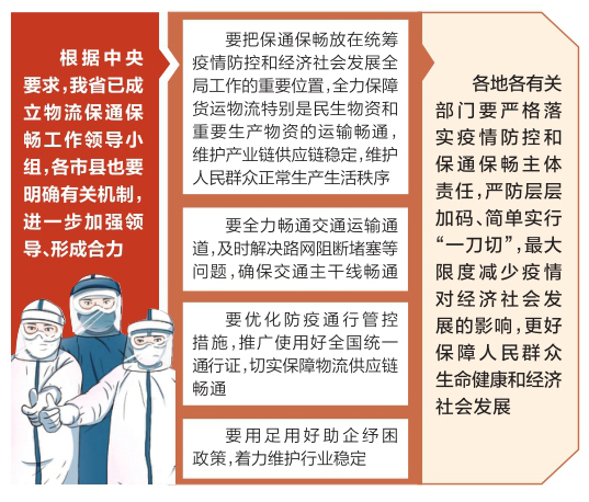 林武指出,根据中央要求,我省已成立物流保通保畅工作领导小组,各市县也要明确有关机制,进一步加强领导、形成合力。要把保通保畅放在统筹疫情防控和经济社会发展全局工作的重要位置,积极主动稳妥处理好突出矛盾,全力保障货运物流特别是医疗防控物资、生活必需品、政府储备物资、邮政快递等民生物资和农业、能源、原材料等重要生产物资的运输畅通,维护产业链供应链稳定,维护人民群众正常生产生活秩序。要全力畅通交通运输通道,落实好部省站三级调度、路警联动、区域协调的工作机制,加强路网监测调度,科学合理设置防疫检查点,及时解决路网阻断堵塞等问题,确保交通主干线畅通。要优化防疫通行管控措施,推广使用好全国统一通行证,实行“即采即走即追”闭环管理,建立重点产业企业白名单,切实保障物流供应链畅通。要用足用好助企纾困政策,及时为货运企业和个体工商户解决实际困难,做好有关司乘人员免费检测等服务,着力维护行业稳定。林武强调,各地各有关部门要严格落实疫情防控和保通保畅主体责任,主要负责同志要扛好第一责任人责任,推动层层提升科学精准防控能力,严防层层加码、简单实行“一刀切”,最大限度减少疫情对经济社会发展的影响,更好保障人民群众生命健康和经济社会发展。