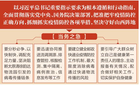 林武指出,当务之急,要分秒必争、以快制快,调配充足力量,坚决阻断太原清徐韵达物流园引发的病毒传播链条。要迅速协同推进流调溯源、排查管控、核酸检测、集中隔离、病例救治、信息发布等工作,对重点区域人群实行“抗原+核酸”交替检测,以有力有效的分区管控处置,确保把有关风险人员全部包进来、管控住。要建立健全邮政快递业疫情防控工作机制,加强快递物流总仓管理,严格做好相关从业人员筛查检测工作,严格进、销、储、运等全流程防控和信息监管,严格落实全方位消毒消杀要求,严格执行静置期规定,最大限度消除病毒通过快递物流传播的风险。要引导广大群众树立自己是健康第一责任人的理念,主动报备有关情况,配合做好相关工作,切实保护自身健康。