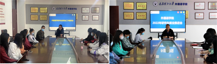 多方联动,大力推进学生就业工作。近年来,外语专业的本科就业率、考研率以及研究生就业率在全校名列前茅。面对由于受到新冠疫情等多重因素而更加复杂严峻就业形势,学院认真贯彻落实学校相关工作要求,提前谋划,多措并举,联动发力,努力做好2022届毕业生就业指导和服务工作。一方面,扎实做好毕业生就业服务管理,及时将用人单位招聘信息推送给待就业毕业生;另一方面,结合毕业生个人就业需求,针对性的点对点为其推荐工作单位和岗位;同时,在校企联动、家校联动的基础上,发动全体教职工努力挖掘社会资源为学生提供就业岗位;近一段时间,学院针对毕业生需求,连续召开多场就业专题座谈和推进会,开展一对一指导,不断加强毕业生的就业引导和服务,努力帮助同学们树立科学合理的就业择业和职业发展观念,全力推动毕业生尽快实现就业。