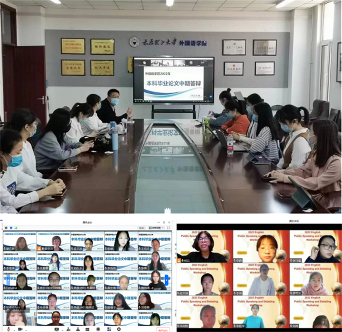 为推进英语本科国家一流专业建设,提升本科毕业论文质量,学院进一步严格2022届本科生毕业论文工作安排的落实。在前期完成论文选题和开题报告等工作的基础上,学院于4月26日、27日两天,通过线上线下相结合的方式,组织开展了2022届本科毕业论文中期答辩工作。各组指导教师根据学生汇报情况,针对性地提出了完善意见,为学生的后续论文写作指明了方向。封闭在校园的院党委书记刘兵教授,作为英语国家一流专业建设点的负责人,在前期开展线下论文指导的基础上,与线上指导教师共同组织翻译方向同学的现场答辩。此次论文中期答辩完全按照正式毕业答辩的流程进行,收到了良好的效果和反馈。参加答辩的同学普遍反映“仪式感很强”,“压力大但收获也大”,“要认真完成毕业论文了”。