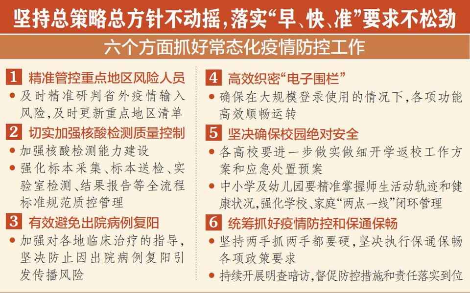 林武指出,面对近期我省疫情多链传播、多地散发的情况,省委加强统一领导和工作调度,及时调整完善防控措施,全省上下齐心协力、有效应对,在较短时间内扑灭了各疫情燃点,维护了全省疫情防控基本面持续向好。但要清醒看到,奥密克戎变异毒株还在高位流行,我省面临的外防输入压力仍然很大、任务仍然很重。围绕抓好常态化疫情防控工作,林武提出六个方面要求。一是精准管控重点地区风险人员。要认真落实国务院联防联控机制要求,紧盯出现一定范围社区传播或已实施大范围社区管控措施的疫情发生地,并基于疫情输入风险研判结果,对7天内来自该疫情发生地所在县区的流入人员,参照中风险区旅居史人员的防控要求,采取相应管控措施。要加强专班力量建设,及时精准研判省外疫情输入风险,及时更新重点地区清单,以最快速度及时推送至市县及交通场站、道路卡口和村(社区)。二是切实加强核酸检测质量控制。要加强核酸检测能力建设,确保各地核酸抽检达到一定覆盖面。要进一步强化标本采集、标本送检、实验室检测、结果报告等全流程标准规范质控管理,确保检测结果准确及时,防止“假阳性”“假阴性”情况发生。三是有效避免出院病例复阳。要准确把握奥密克戎变异株特点,加强对各地临床治疗的指导,根据不同病例个体情况,适度延长治愈出院后的健康监测时间,坚决防止因出院病例复阳引发传播风险。四是高效织密“电子围栏”。要开展核酸采样、结果查询、赋码变码等平台系统的压力测试,切实提升各项信息系统的通道容量,加强热备切换能力建设,确保在大规模登录使用的情况下,各项功能高效顺畅运转。五是坚决确保校园绝对安全。各高校要进一步做实做细开学返校工作方案和应急处置预案,引导学生做好返校途中个人防护,分类做好学生健康监测和静态管理。中小学及幼儿园要精准掌握师生活动轨迹和健康状况,强化学校、家庭“两点一线”闭环管理,严防疫情进入校园。六是统筹抓好疫情防控和保通保畅。要坚持两手抓两手都要硬,坚决执行保通保畅各项政策要求,坚决防止层层加码、过度管控问题,持续巩固保通保畅工作成效。要持续开展明查暗访,督促防控措施和责任落实到位。有关地方和单位要清单化抓好整改,确保立行立改、彻底整改。