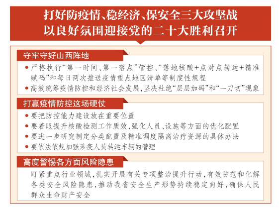 蓝佛安指出,各级各部门要坚决落实省委决策部署,把疫情防控与煤矿安全生产作为安全稳定工作的重中之重,压紧压实领导干部、防控部门、外防输入、流调筛查、核酸检测、医疗救助、进口冷链总仓、快递物流总仓及旅游景区等九个方面责任,加强统筹指导,慎终如始做好疫情防控工作,狠抓煤矿等各行业领域风险隐患排查整治,坚决守住不发生重特大安全事故的底线。同时紧盯全年目标任务,持续推进国家及我省稳经济一揽子政策、接续政策落地落实,紧抓国庆等节庆热点,加快释放消费潜力,加大项目谋划包装力度,做好项目前期,争取更多政策性开发性金融工具支持,大力促进工业经济稳定增长,扎实做好冬季取暖等民生工作,为党的二十大胜利召开营造平稳健康的经济环境、国泰民安的社会环境、风清气正的政治环境。