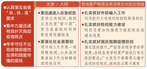 林武指出,在高效精准抓好应急处置的同时,各地要认真贯彻国务院联防联控机制要求,严格落实各项常态化防控措施。一要扎实抓好外防输入工作,持续严格风险人员排查管控,持续强化社会面常态化核酸筛查,持续加强交通场站、酒店民宿、景区商超、文娱场所等重点部位的防控工作,切实把行之有效的防控机制落到位。二要扎实抓好防控能力建设,特别是要加快推进方舱医院改造建设进度,进一步强化集中隔离场所的达标储备,宁可备而不用,也决不能用时无备。要加强对第三方检测机构的规范管理,全面提升核酸采样和检测能力。三要扎实抓好国庆假期疫情防控,强化值班值守,严格落实领导带班等制度,保证有足够防控力量在班在岗,全面做好各项应急准备工作。各级各类学校要细化假期安排,严格执行有关防控要求,同步做好服务保障和学生思想工作,确保校园安全稳定。广大党员干部要带头遵守各项防疫规定,带动广大群众做好自我防护,做到非必要不离晋。要持续强化对防控政策执行情况的督导检查,推动工作落实、措施落实、责任落实。