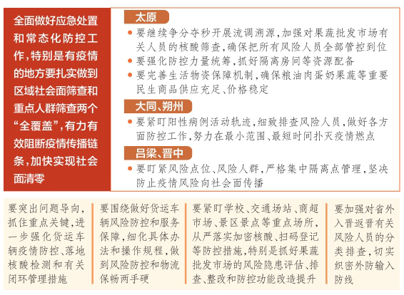 林武在讲话中分析研判了全省疫情形势,对输入性疫情应急处置工作提出要求,对持续筑牢外防输入防线作出部署。他强调,要毫不动摇坚持疫情防控总策略总方针,按照省委“早、快、准”要求,全面做好应急处置和常态化防控工作,特别是有疫情的地方要扎实做到区域社会面筛查和重点人群筛查两个“全覆盖”,有力有效阻断疫情传播链条,加快实现社会面清零,坚决打赢疫情防控攻坚战歼灭战。太原市要继续争分夺秒开展流调溯源,加强对果蔬批发市场有关人员的核酸筛查,确保把所有风险人员全部管控到位。要强化防控力量统筹,抓好隔离房间等资源配备。要完善生活物资保障机制,确保粮油肉蛋奶果蔬等重要民生商品供应充足、价格稳定。大同市、朔州市要紧盯阳性病例活动轨迹,细致排查风险人员,做好各方面防控工作,努力在最小范围、最短时间扑灭疫情燃点。吕梁市、晋中市要盯紧风险点位、风险人群,严格集中隔离点管理,坚决防止疫情风险向社会面传播。
