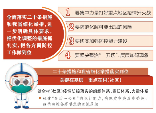 蓝佛安指出,各级各部门要坚决把思想和行动统一到习近平总书记关于疫情防控的重要论述上来,把打好局部疫情歼灭战作为当务之急,采取更为坚决果断措施,迅速扑灭疫情燃点,尽早实现社会面滚动清零目标。要完整、准确、全面贯彻落实党中央、国务院决策部署,保持战略定力,坚持防控总策略总方针不动摇,科学精准做好防疫工作,防范化解可能出现的风险,坚决防止“一刀切”和层层加码等现象,保障群众正常生产生活秩序,加强组织领导,开展宣传培训,守土有责、守土尽责,不折不扣推动“二十条优化措施”落地见效。要制定细化具体方案,加强政策衔接,分解压实责任,推动专班各司其职、形成合力,持续提升我省疫情防控科学化精准化水平。