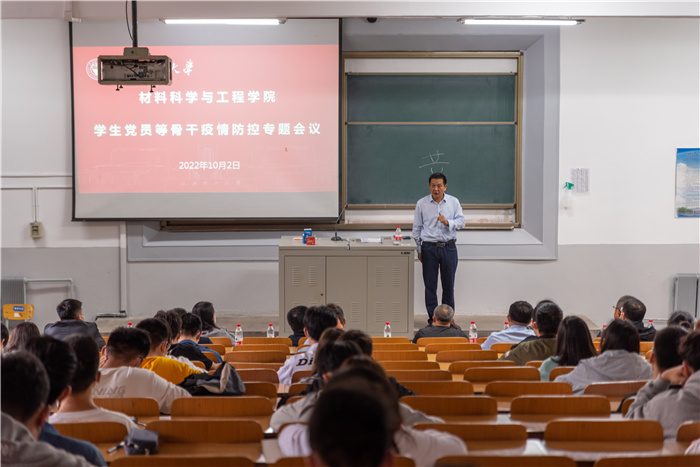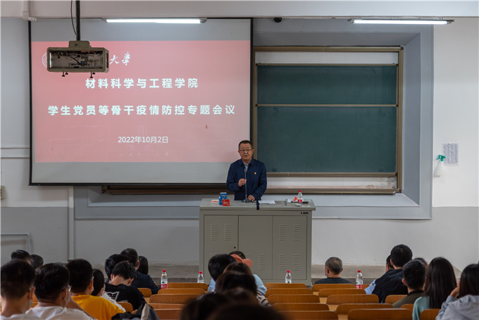 为进一步贯彻落实好学校疫情防控各项政策,确保师生健康安全,10月2日下午,材料科学与工程学院在迎西校区组织学生党员、班团干部等学生骨干召开疫情防控专题会议。校党委刘润祥副书记应邀出席并讲话,对基层学院做细做实防控工作做出具体指导,对学生党员提出明确要求。相关部门负责人和迎西校区兄弟学院领导列席会议。材料科学与工程学院学生党员及学生骨干代表参会。会议由学院党委书记张忠璞主持。
